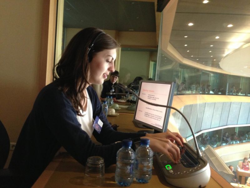 Переводчик сидит в отдельной кабинке, где через особую аудиоаппаратуру внимательно слушает оратора. А готовый перевод аудитория получает посредством индивидуальной гарнитуры.
